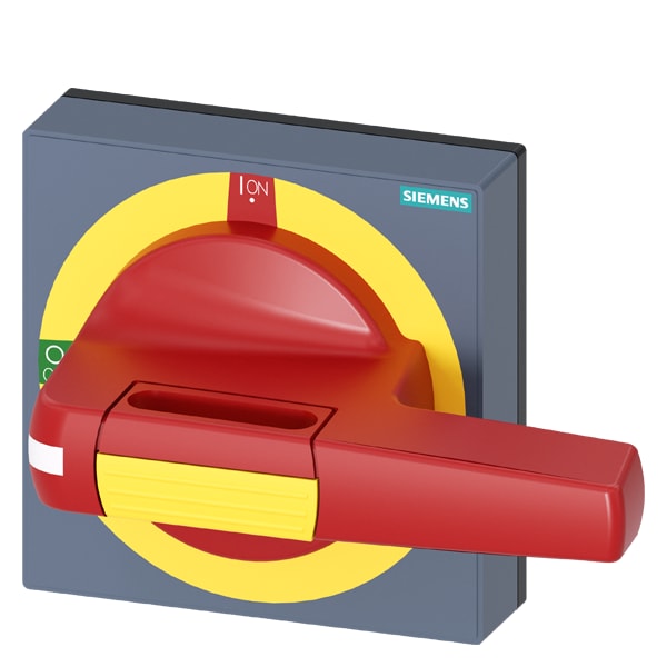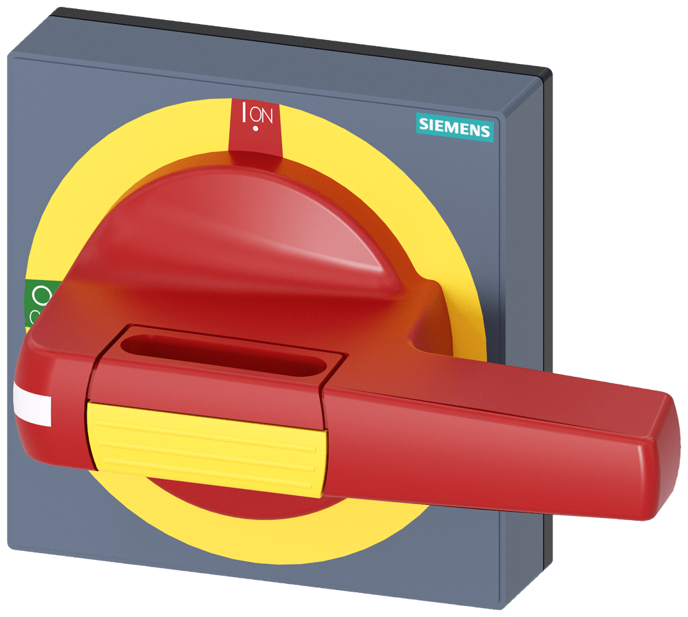 manopola con mostrina frontale emergenza dimensioni 100 x 100, per albero 8 x 8, 0-I, operatore grandezza 100mm accessori per 3KD grand. costr. 3, 3KF grand. costr. 2 e 3 Comandi manuali per un comodo utilizzo dellinterruttore automatico scatolato 3VA. Disponibilità come comando rotativo frontale, per porta e parete laterale con diverse possibilità di chiusura a chiave e con interblocco Le manopole sono disponibili nelle varianti standard e ARRESTO DI EMERGENZA, ciascuna con o senza kit di illuminazione.Interruttori automatici scatolati SENTRON 3VA - Un sistema. Per tutte le applicazioni.