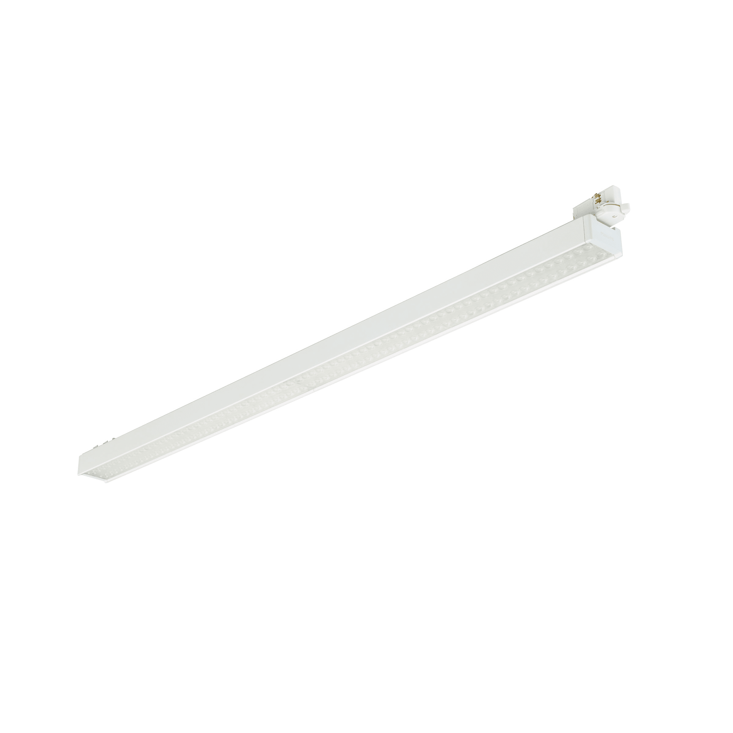 L1200 mm, Alluminio estruso, Bianco, Unità di alimentazione (On/Off), 8000 lm, 54 W, 148 lm/W, 4000 K, (0.38, 0.38) SDCM3, Ottica asimmetrica doppia 45°, Trasparente, Policarbonato, IP20 | Protetto contro l'accesso con un dito, IK02 | 0,2 J standard, Classe di isolamento I, Binario