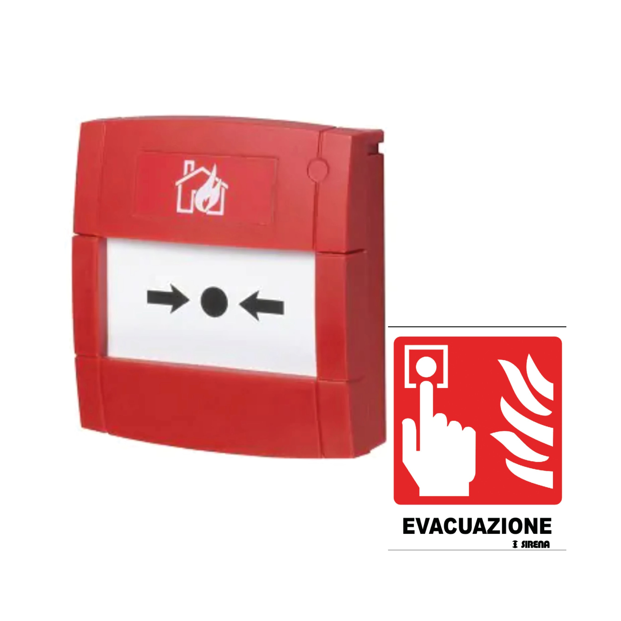 PULSANTI MANUALI RIPRISTINABILI - CONFORMI EN54-11 / Materiale termoplastico colore rosso (RAL 3000) / Pittogramma europeo universale / Protezione: IP24 oppure IP66 / Contatto interno: 1 x C-NC-NA Nel SISTEMA PCS: modulo di comunicazione indirizzato