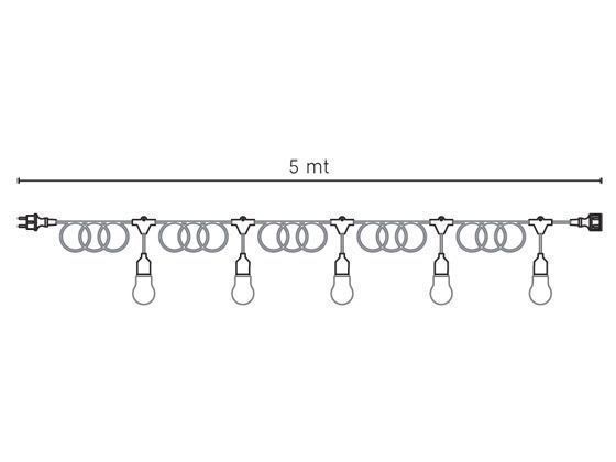 Cavo per esterno in termoplastico. Lunghezza 5 metri. 5 portalampada E27. Completo di spina e presa schuko. Alimentazione 230. Classe di protezione: IP43 Numero lampade: 5 Potenza massima lampade: 20W
