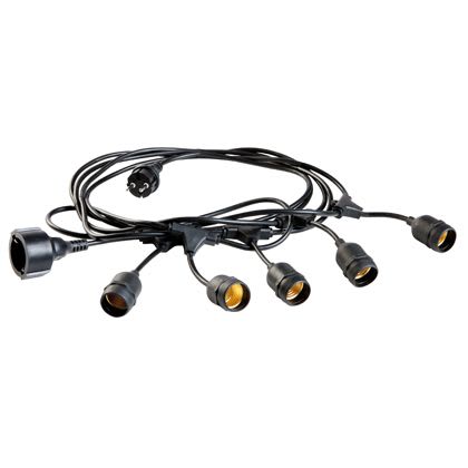 Cavo per esterno in termoplastico. Lunghezza 5 metri. 5 portalampada E27. Completo di spina e presa schuko. Alimentazione 230. Classe di protezione: IP43 Numero lampade: 5 Potenza massima lampade: 20W