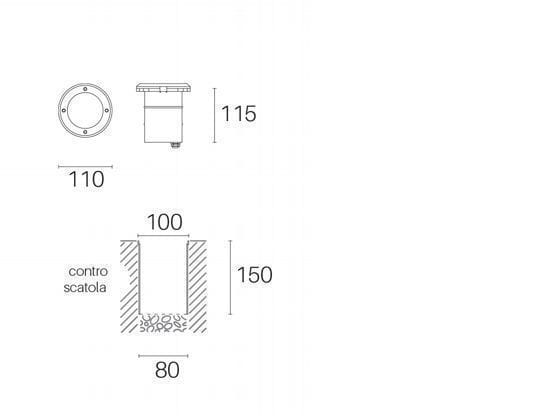 Struttura in pressofusione di alluminio. Anello di copertura in acciao inox. Diffusore in vetro trasparente infrangibile: max 500kg. Parabola riflettente in alluminio. Controscatola in termoplastico. Guarnizione siliconica e accessori per il fissaggio. Pressacavo PG11. Portalampada in porcellana con attacco GU10. Altezza lampada: max 65mm. Adatto esclusivamente per lampade a risparmio energergetico. Lampada esclusa. Alimentazione 230V ~ 50Hz. Classe di protezione: IP65 Potenza massima lampade: 11W