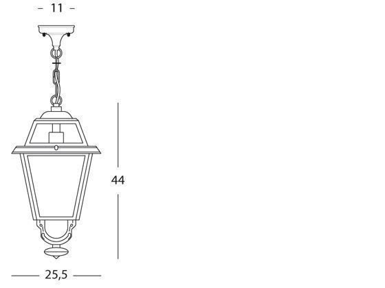 Struttura in pressofusione di alluminio. Diffusori in vetro trasparente. Controbase e accessori per il fissaggio. Sospensione con cavo H05RN-F 3G1 Portalampada in porcellana con attacco E27. Altezza lampada: max 210mm. Lampada esclusa. Alimentazione 230V~ 50Hz. Classe di protezione: IP43 Potenza massima lampade: 100W