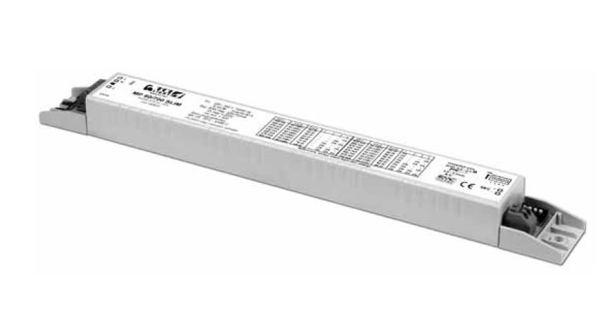Alimentatore da incorporare. Alimentatore multipotenza fornito di dip-switch perla selezione della corrente in uscita. PFC attivo. Corrente regolata ±5 % inclusevariazioni di temperatura. Uscita non isolata dall’ingresso. Utilizzabile per apparecchidi illuminazione in classe di protezione I e II. Morsetti di entrata e uscitacontrapposti (sezione cavo fino a 1,5 mm2 / AWG15).Fissaggio dell’alimentatore tramite asole per viti. Protezioni: termica e cortocircuito;contro le extra-tensioni di rete; contro i sovraccarichi. Protezione termica = C.5.a.