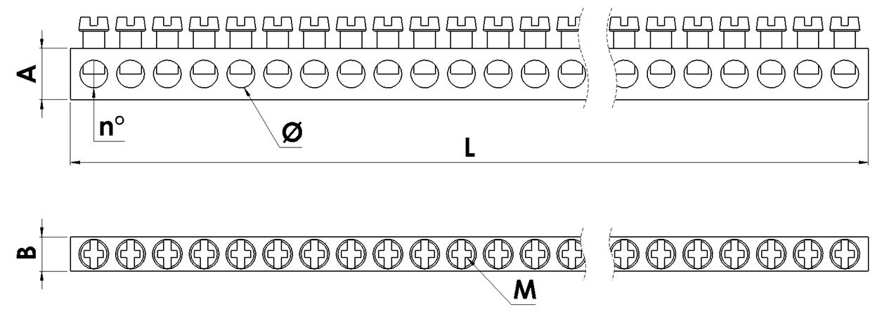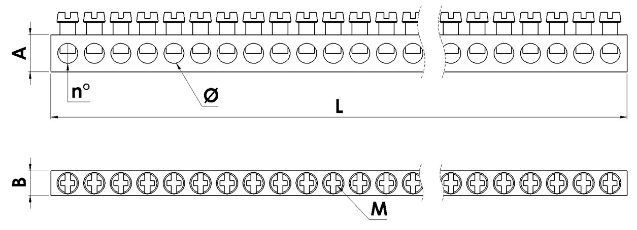 Morsetto per barra di rame, marca TEKNOMEGA SRL, modello TKGMRS1501 - BARRA DI MESSA A TERRA IN OTTONE 9X6 L1M