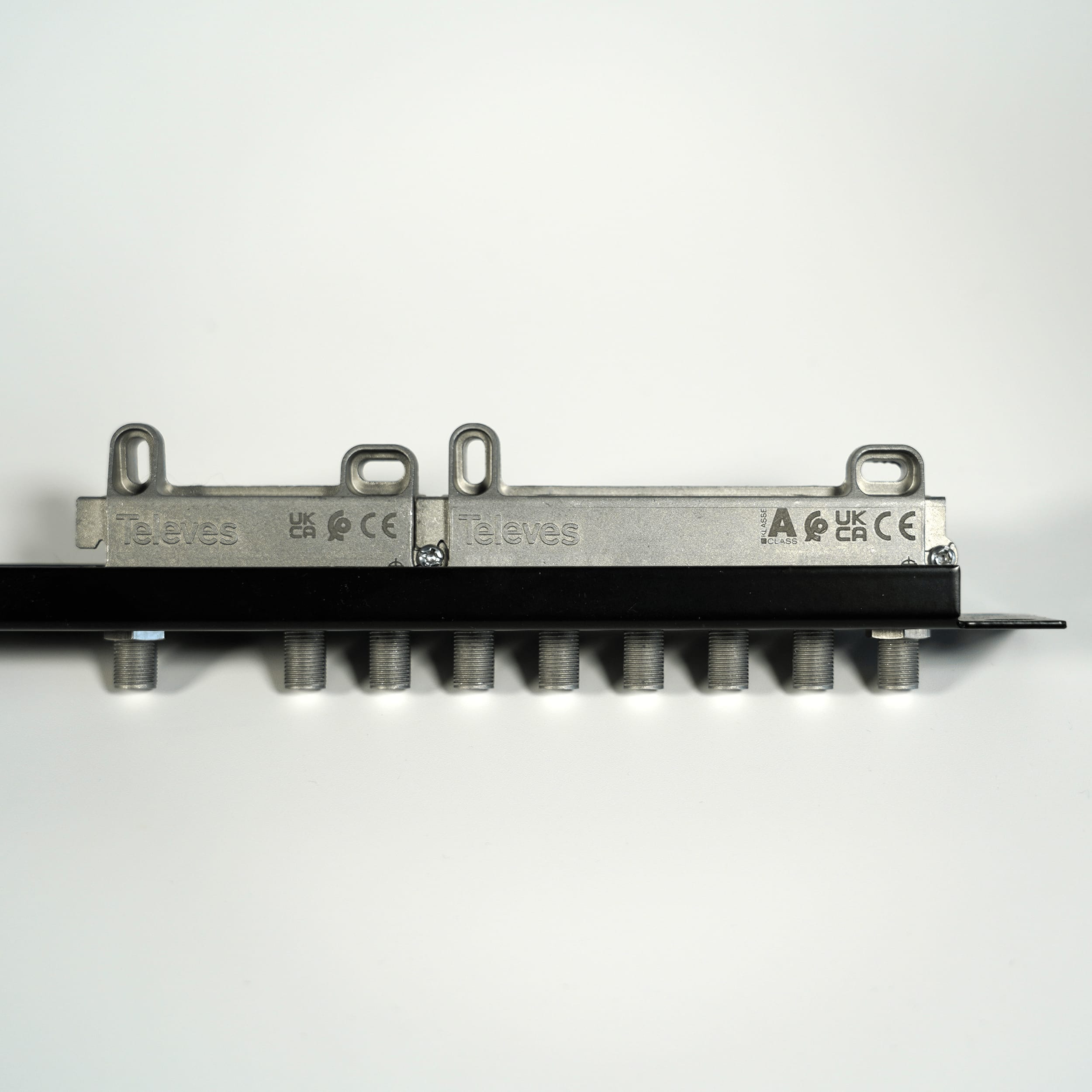 Partitore F 5 Vie 5...2400MHz 11/10dB. Partitore a 5 vie con connettori F, per segnali SMATV. Presenta basse perdite di passaggio grazie al suo design compatto e al suo efficiente comportamento elettronico. Inoltre, il suo telaio offre un'ottima schermatura poiché è realizzato in Zamak.Partitori per installazioni da interno, montaggio a parete, su piastra rack o su guida DIN standard. Imballaggio: Scatola, Metodo di fornitura: Imballo multipo.. Flessibilità di montaggio: può essere installato tramite viti a parete, su piastre rack con dadi sui relativi connettori, o su guida DIN standard (con adattatore art. 519901). Facilità di inserimento del cavo, grazie all'angolo di inclinazione di 10º dei connettori F rispetto alla parete di installazione. Ottimizzazione dello spazio nelle cassette di derivazione e negli armadi: i suoi connettori si trovano sempre sullo stesso lato. Migliore organizzazione dell'impianto: permette il passaggio dei cavi attraverso la sua parte posteriore. Tutti i partitori di questagamma possono essere fissati tramite vite, richiedendo un unico cavo di messa a terra. Mantiene i livelli alla presa, anche con cavi lunghi, grazie a una migliore planarità nella risposta al passaggio. Elevata affidabilità: produzione in linee robotizzate con microchip all'avanguardia. Basse perdite di passaggio. Ottima schermatura (classe A), fabbricato in Zamak. Connettori F con sezione filettata maggiorata, per facilitare e rendere sicura la loro installazione su piastra rack. Montaggio da interno. Include vite per la messa a terra. Passaggio di DC dalle uscite all'ingresso. Design, qualità e produzione 100% europei.