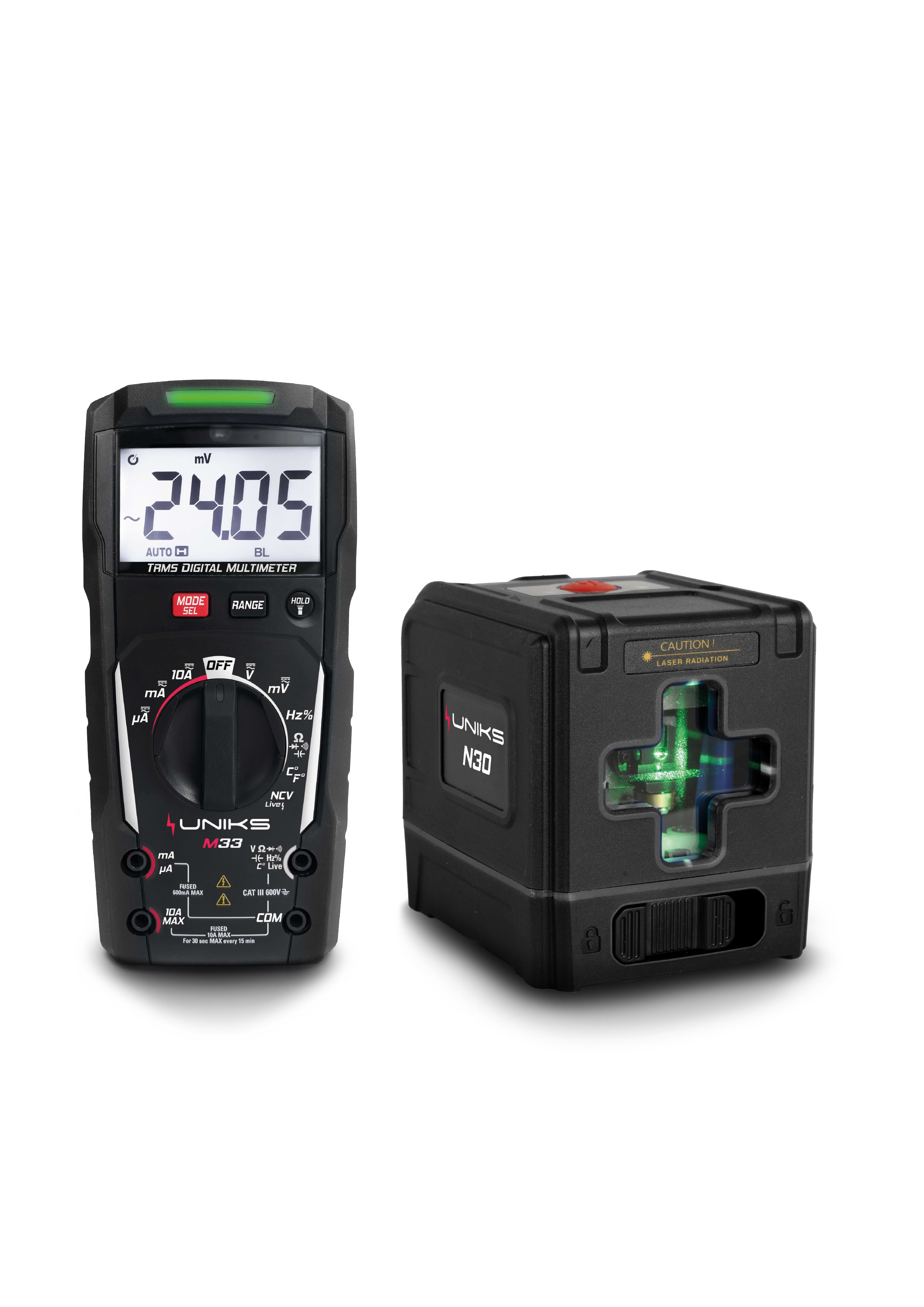 M33 Multimetro 600V AC/DC TRMS - Corrente 10A AC/Dc + livella laser verde classe II in omaggio. - Funzione AUTO Backlight - NCV Tensione senza contatto. - CAT II - 1000V - CAT III - 600V