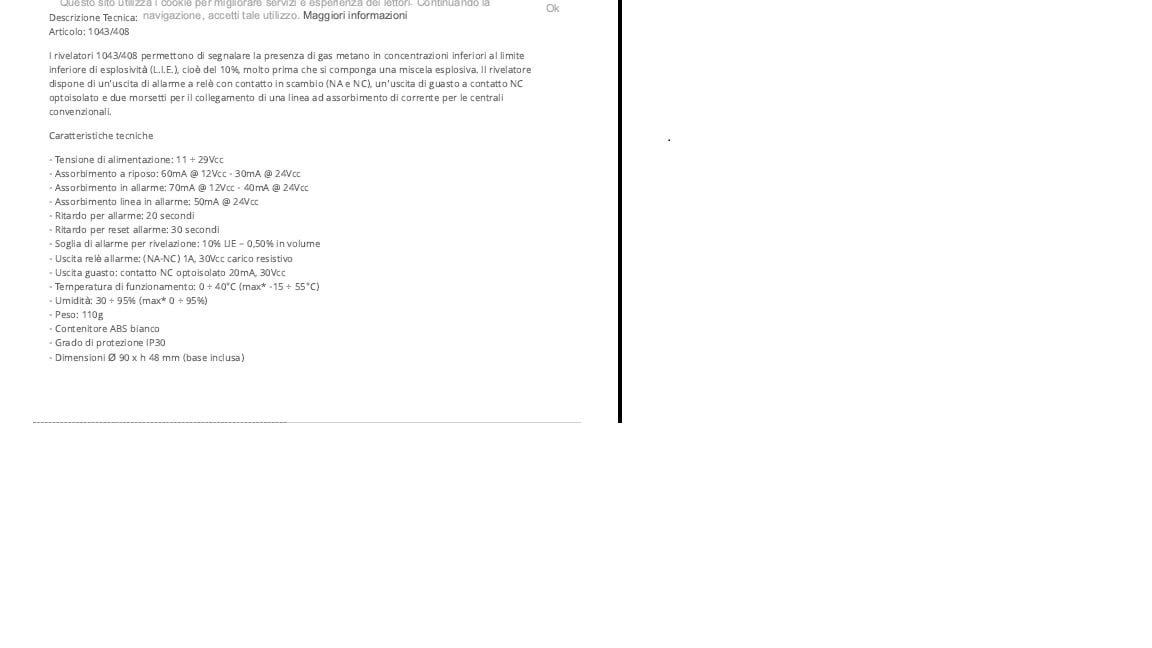 Rilevatore di gas metano.I rivelatori 1043/408 permettono di segnalare la presenza di gas metano in concentrazioni inferiori al limite inferiore di esplosività (L.I.E.), cioè del 10%, molto prima che si componga una miscela esplosiva. Il rivelatore dispone di un’uscita di allarme a relè con contatto in scambio (NA e NC), un’uscita di guasto a contatto NC optoisolato e due morsetti per il collegamento di una linea ad assorbimento di corrente per le centrali convenzionali.