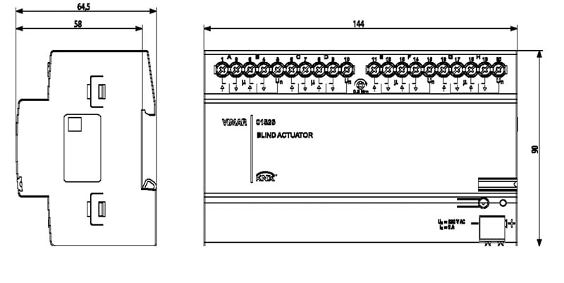 Attuatore per 8 tapparelle con uscite a relè 6 A 230V~ 50/60 Hz, standard KNX, installazione su guida DIN (60715 TH35), occupa 8 moduli da 17,5 mm.