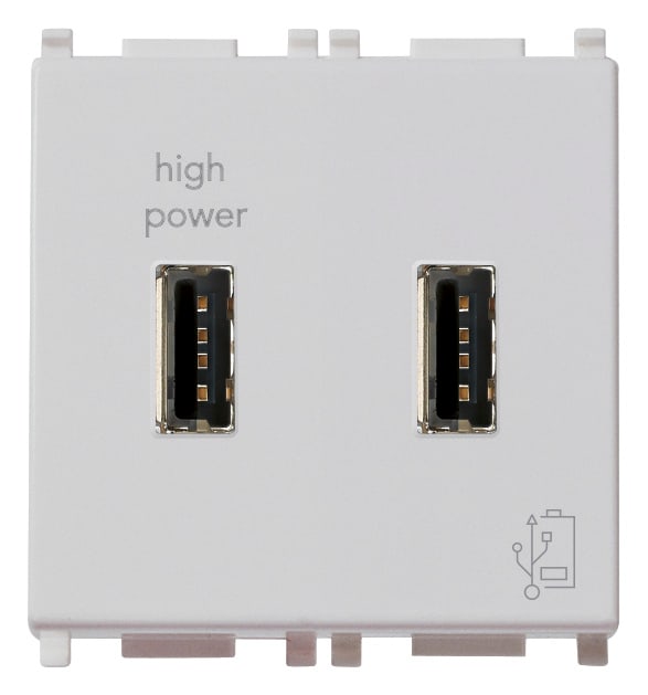 Unità di alimentazione 5 V 2,1 A per dispositivi elettronici, 2 uscite USB frontali, alimentazione 120-230 V~ 50/60 Hz - 2 moduli. Il dispositivo va utilizzato per ricaricare i telefoni cellulari e tutti gli apparecchi elettronici che offrono la possibilità di ricarica da una qualsiasi presa standard USB. Il dispositivo permette di ricaricare due apparecchi contemporaneamente.