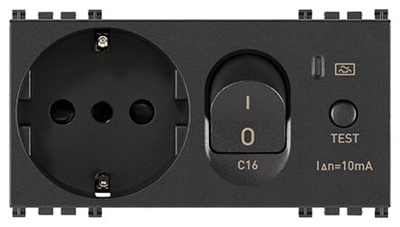 Presa SICURY 2P+T 16 A standard italiano tipo P30 (contatti di terra laterali e centrale), interbloccata con interruttore automatico magnetotermico differenziale 1P+N C 16, 230 V~ 50 Hz, I∆n 10 mA, p.i. 3000 A, grigio - 4 moduli