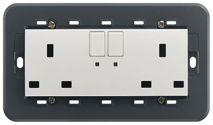 Due prese SICURY 2P+T 13 A 250 V~ standard inglese con due interruttori 2P con spia luminosa, complete di supporto per installazione in scatole rettangolari BS, da completare con placca 5 moduli BS, Next