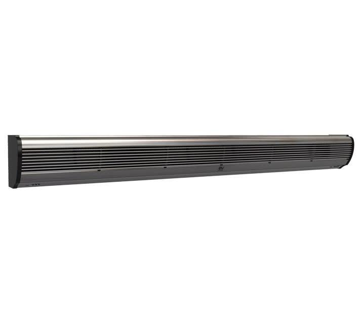 Barriere d’aria per installazione orizzontale fissa in corrispondenza delle porte e, più in generale, delle zone di accesso di locali pubblici, negozi, supermercati o centri commerciali, generano una lama d’aria che ostacola l’ingresso di aria esterna a temperatura diversa da quella desiderata. Particolarmente indicate anche per prevenire l’ingresso di fumo, smog o insetti ed evitare la diffusione di odori tra ambienti contigui. Involucri caratterizzati da pannelli frontali in alluminio spazzolato di colore grigio argento integranti la griglia di aspirazione; pannelli posteriori in lamiera d’acciaio verniciata nera; fianchetti in resina plastica nera. Ventilatori tangenziali, a garanzia di bassi livelli di emissioni sonore, azionati da motori asincroni bialbero a due velocità per il miglior compromesso tra prestazione erogata, temperatura del flusso d’aria generato (nel caso dei modelli con batteria elettrica), e livello di emissione sonora. 2 velocità di funzionamento. I modelli AIR DOOR H hanno batterie elettriche a termoresistori (PTC) caratterizzate da elevate rese termiche e ridotta resistenza aerodinamica, protette contro sovratemperature e picchi di tensione. La specifica logica di funzionamento, che ritarda di 30” l’arresto del ventilatore dopo lo spegnimento della resistenza, contribuisce al loro affidabile funzionamento nel tempo. Alette orientabili, montate in corrispondenza della zona di fuoriuscita dell’aria, permettono di orientare il flusso generato. Consentono risparmio nei consumi perchéevitano la creazione di variazioni termiche e di dispersioni: anche i climatizzatori (in estate) o i riscaldamenti (in inverno) lavorano in modo più efficace, risparmiando a loro volta il proprio consumo. Sono utilizzabili in tutte le stagioni: sono modelli in versione neutra. Grande flessibilità di installazione: la posizione frontale della griglia di aspirazione consente il montaggio anche a ridosso del soffitto nei locali di altezza ridotta (minimo 2.55 m). Facilità e rapidità di installazione, graziealla pratica staffa in dotazione. Possibilità di installazione in serie, per coprire aperture di elevata larghezza. Abbinabili a sensori porta standard presenti sul mercato. Classe di Isolamento: Cl.I .