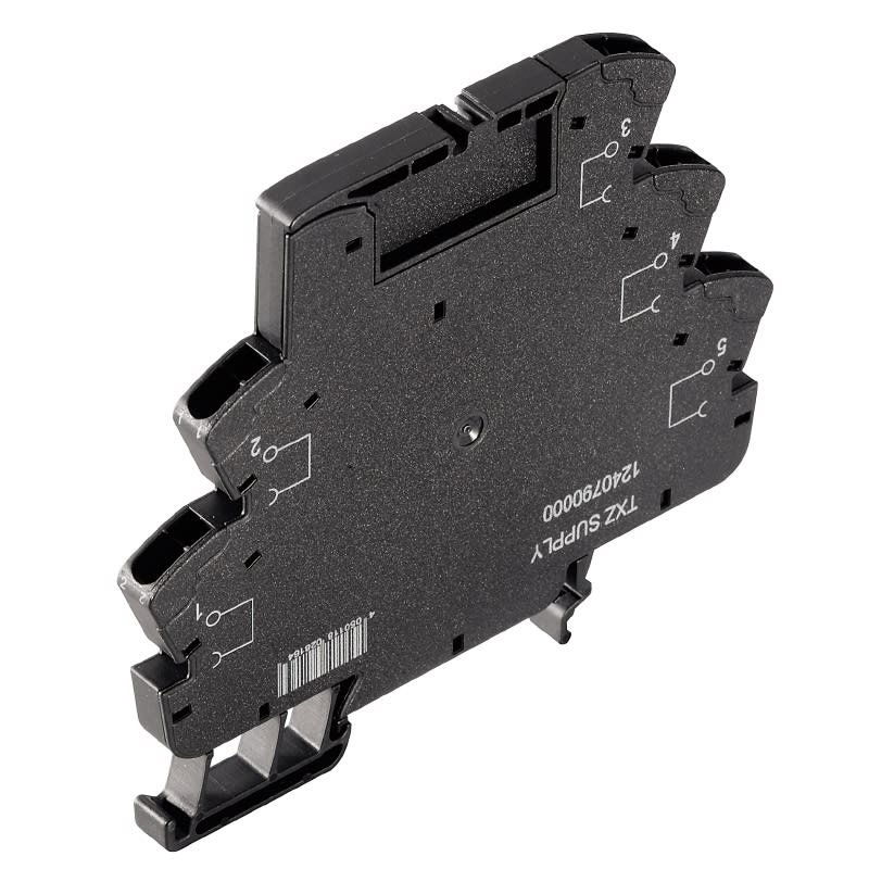Un modulo di alimentazione offre collegamenti supplementari per la fornitura di potenziale con collegamento trasversale. Può essere usato con una varietà di sistemi di collegamento ed è proposto come accessorio per le famiglie di relè corrispondenti.