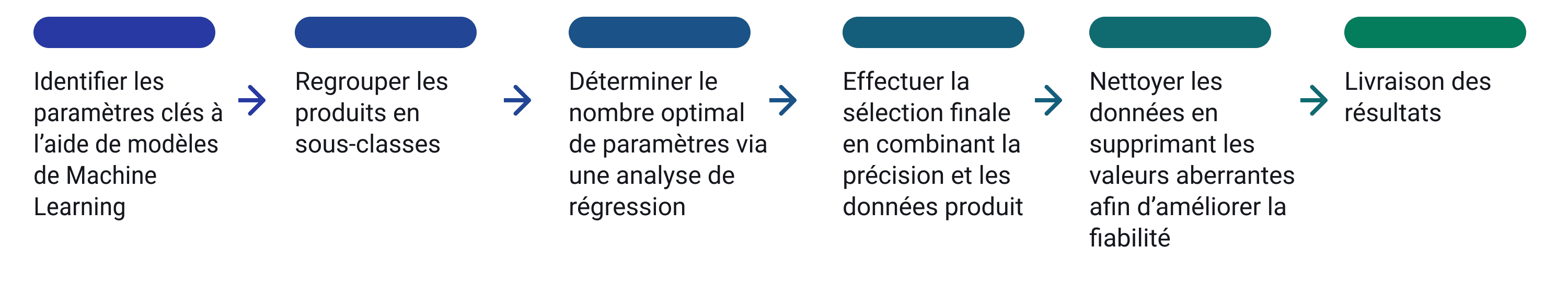 Sonepar effectue des classifications afin d’estimer le CO2-éq moyen à partir des données carbone disponibles et des caractéristiques des produits, telles que la puissance, les dimensions, etc. Les classifications sont réalisées pour subdiviser les classes ETIM en sous-classes homogènes et fournir un ordre de grandeur par produit. Ce processus se déroule selon les étapes suivantes :